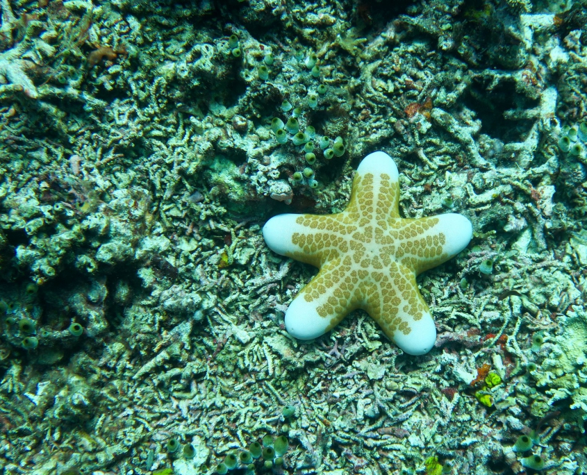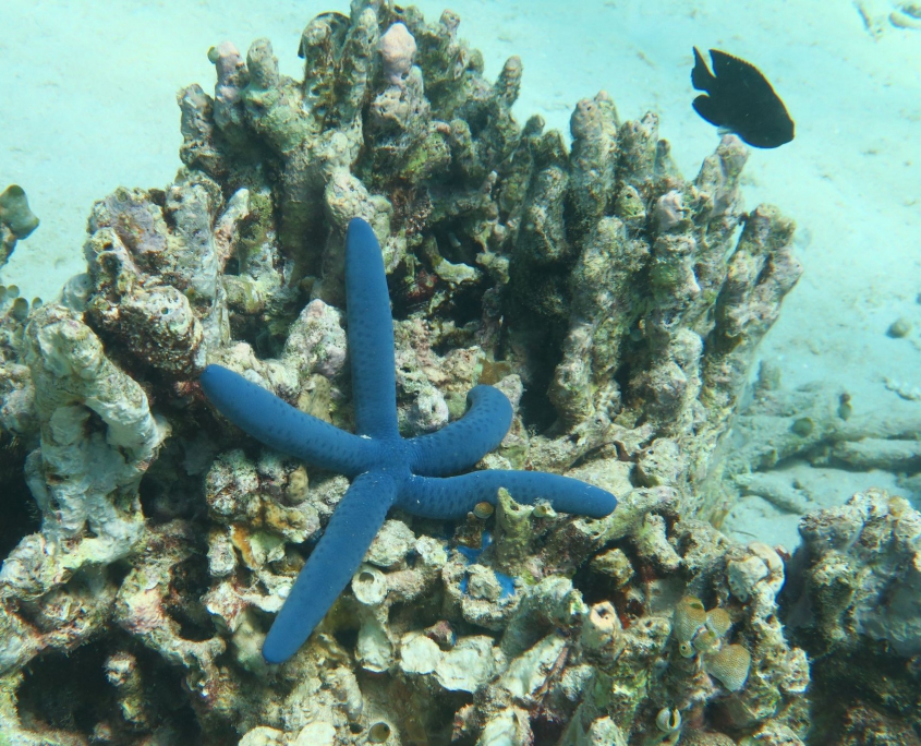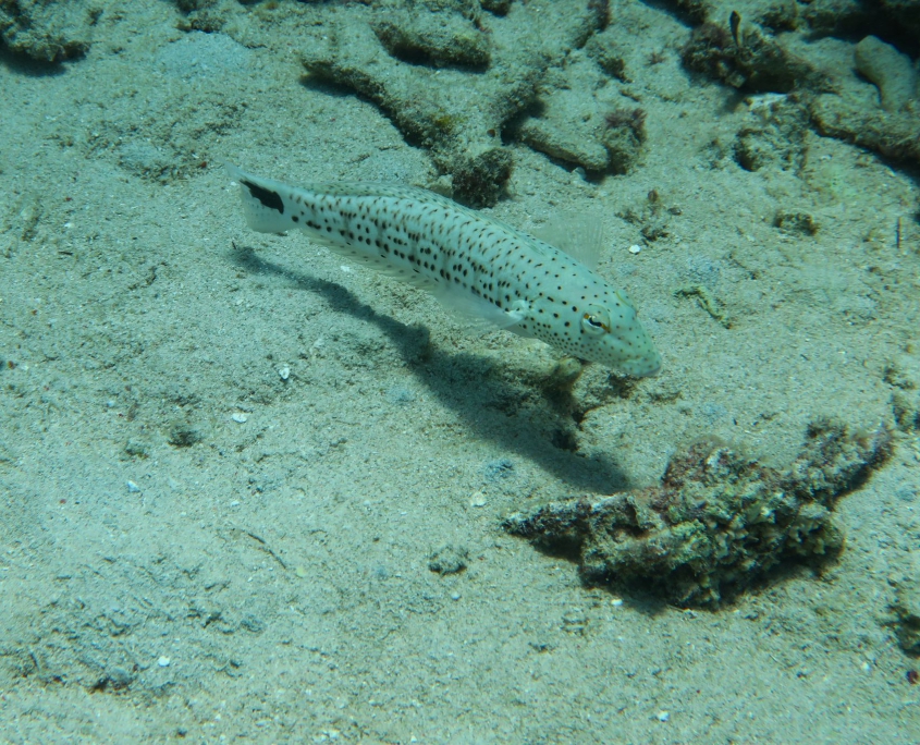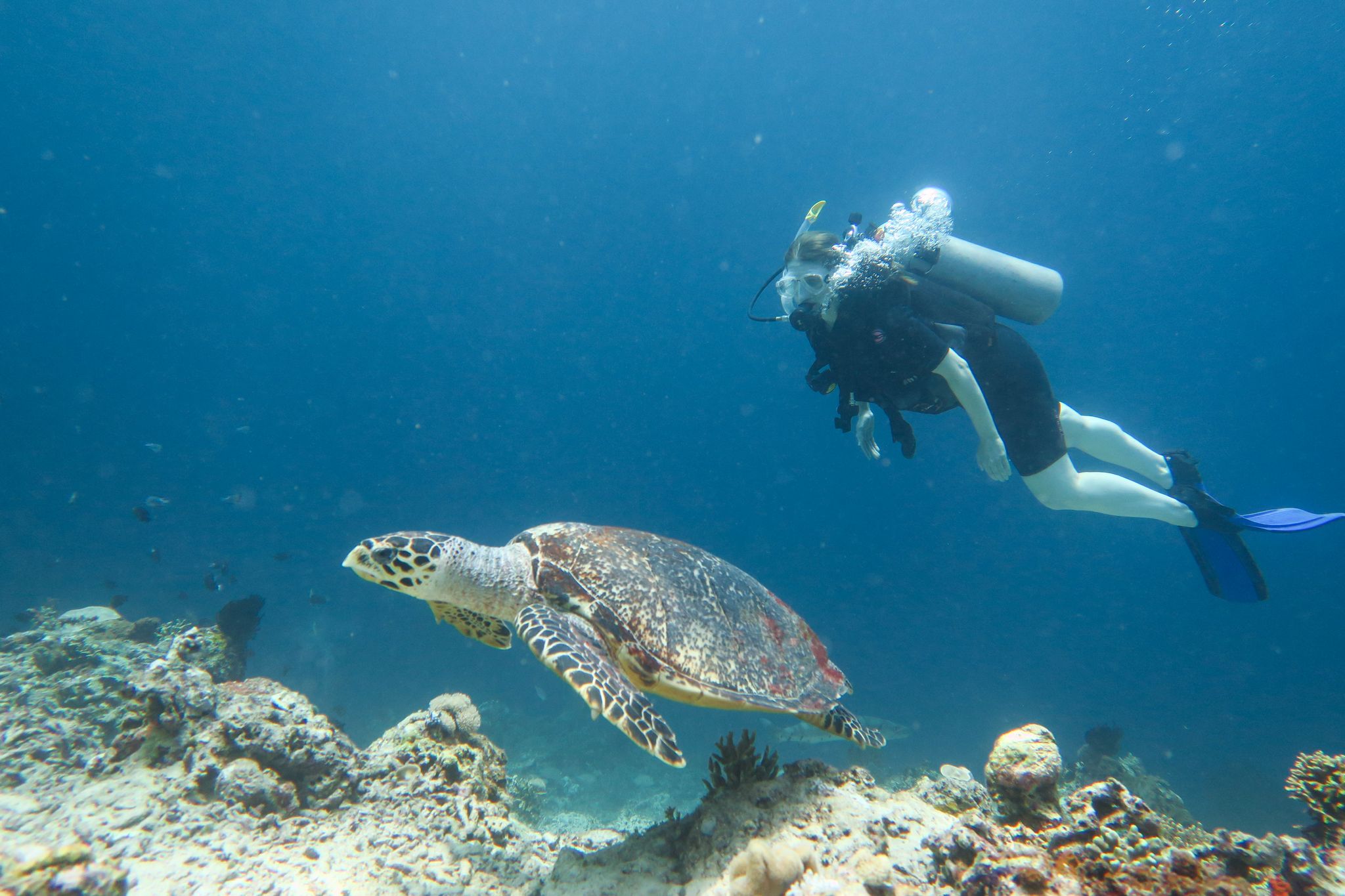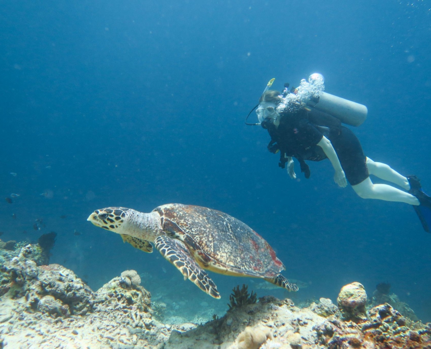 Ich bekomme einen kurzen Refresh in der Zeichensprache und zur Sicherheit beim Tauchen und im Wasser wiederholen wir dann noch kurz die Basics. Finde ich super, dass Curly (der Tauchguide) das macht. Der erste Spot ist „Sandy Slope“. Ich bin enttäuscht, die Korallen sind alle ausgebleicht und auch die Fische sind irgendwie farblos. Der „Coral Garden“, unser zweiter Tauchspot sei besser, versprechen die Guides. und so ist es dann auch. Zwar fehlt es auch hier ein wenig an Farbe, aber es hat viele grosse Fächerkorallen und ich hatte schon kurz Herzklopfen, als da zwei grosse Fische vorbei schwimmen. Aber es waren keine Haie sondern Thunfische. Das Highlight kam dann ganz zum Schluss, ich hatte gerade signalisiert, dass ich auf Reserve laufe (also 50 Bar) und wir langsam auftauchen sollten. Trotzdem liessen wir es uns nicht nehmen ein paar Fotos mit der riesigen Schildkröte zu machen, die da gemütlich daher geschwommen kam.
