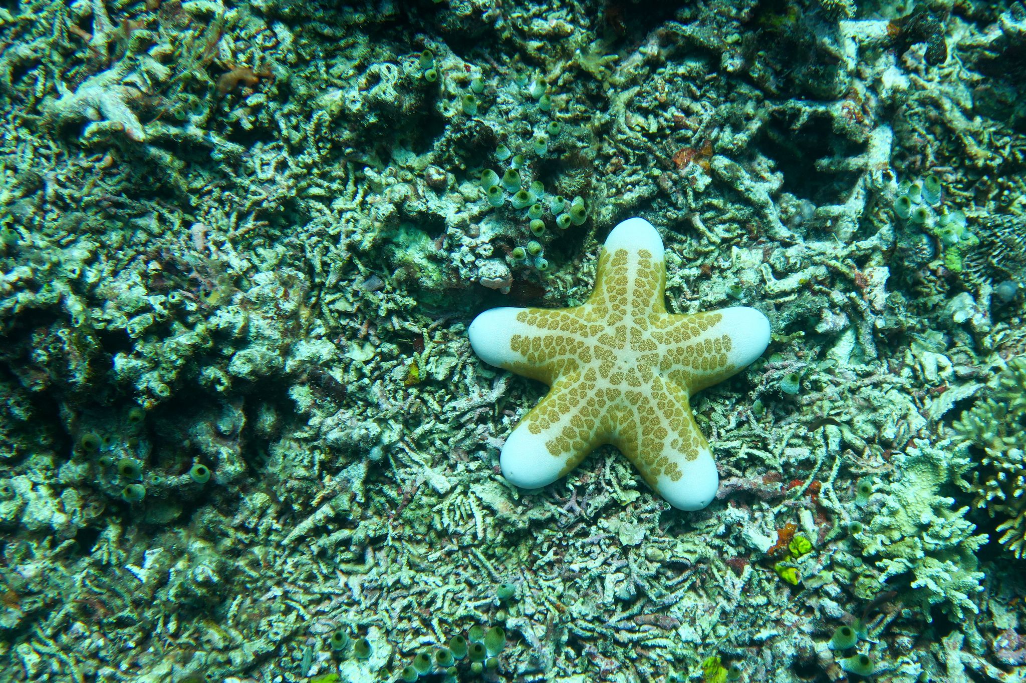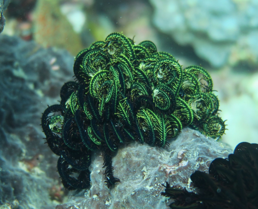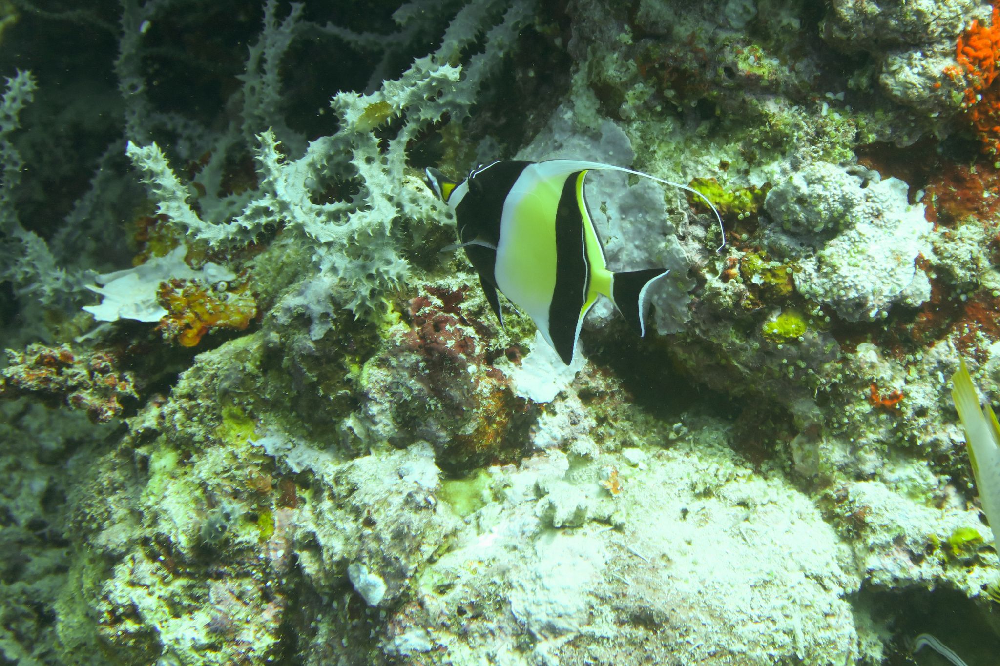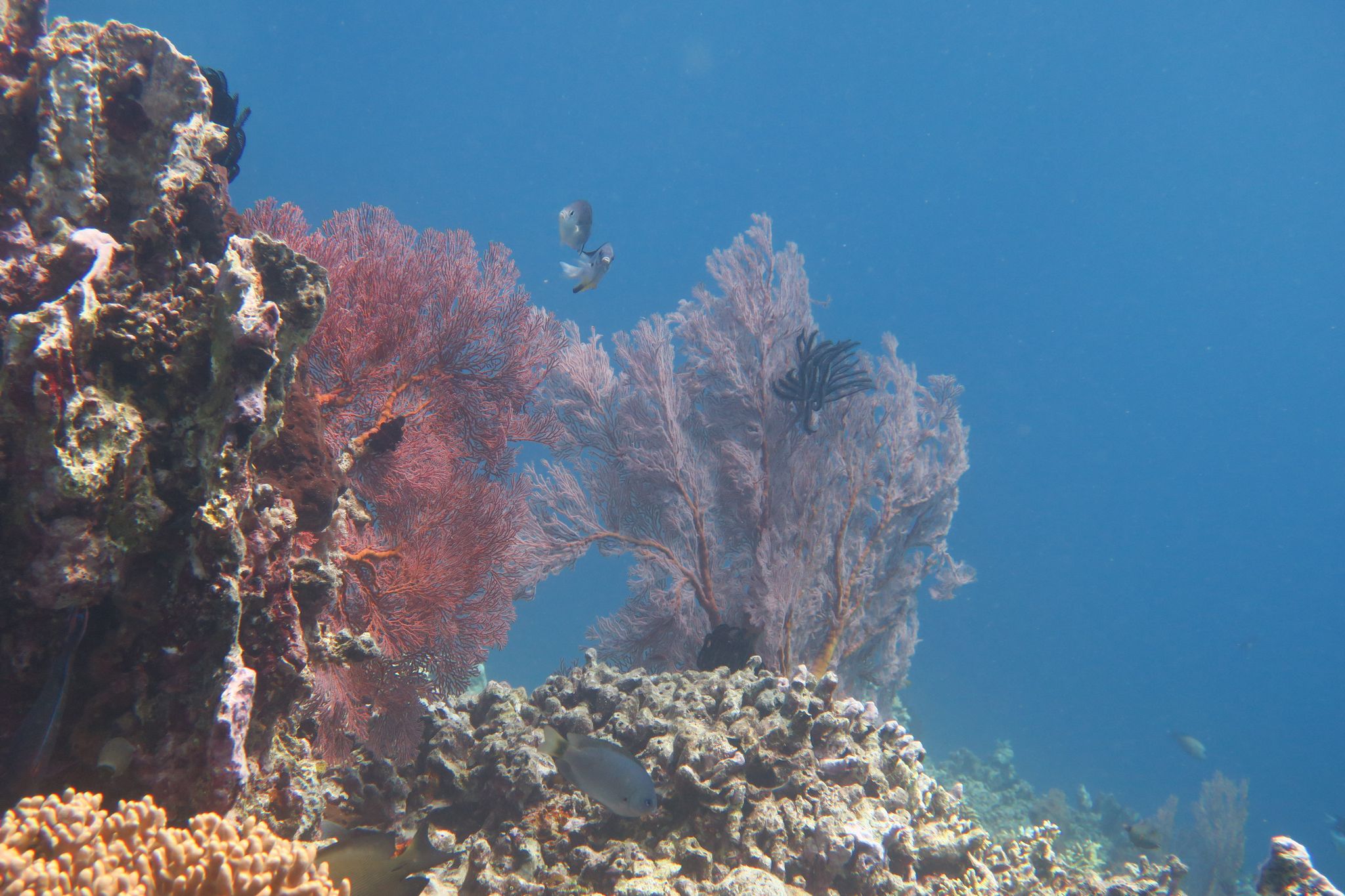 Ich bekomme einen kurzen Refresh in der Zeichensprache und zur Sicherheit beim Tauchen und im Wasser wiederholen wir dann noch kurz die Basics. Finde ich super, dass Curly (der Tauchguide) das macht. Der erste Spot ist „Sandy Slope“. Ich bin enttäuscht, die Korallen sind alle ausgebleicht und auch die Fische sind irgendwie farblos. Der „Coral Garden“, unser zweiter Tauchspot sei besser, versprechen die Guides. und so ist es dann auch. Zwar fehlt es auch hier ein wenig an Farbe, aber es hat viele grosse Fächerkorallen und ich hatte schon kurz Herzklopfen, als da zwei grosse Fische vorbei schwimmen. Aber es waren keine Haie sondern Thunfische. Das Highlight kam dann ganz zum Schluss, ich hatte gerade signalisiert, dass ich auf Reserve laufe (also 50 Bar) und wir langsam auftauchen sollten. Trotzdem liessen wir es uns nicht nehmen ein paar Fotos mit der riesigen Schildkröte zu machen, die da gemütlich daher geschwommen kam.