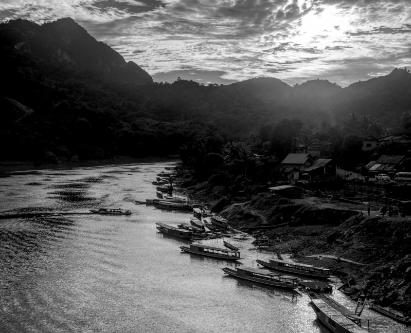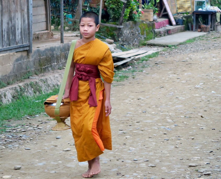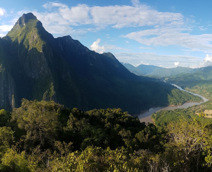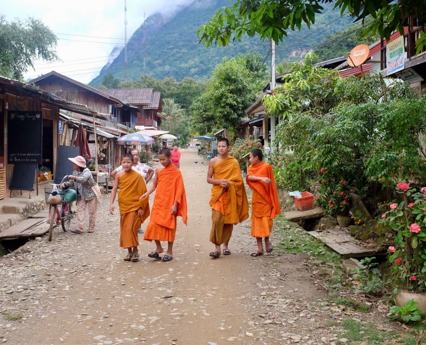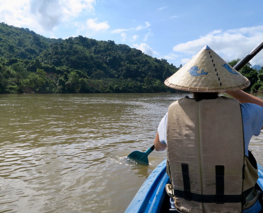 Landschaftlich ist es hier wunderschön. Wir machen Ausflüge zu einem Aussichtspunkt (genau so schwierig wie der in Luang Prabang und gespickt mit Blutegeln), wandern und paddeln zu einigen Dörfern und nehmen am Schluss das Kanu flussabwärts zurück nach Luang Prabang. Der Fluss zieht immer in unterschiedliche Richtungen, es hat viele Wirbel und Hindernisse und so macht Alex die meiste Arbeit, denn wenn nur ich paddle fahren wir im Kreis. Das muss ich wohl noch ein wenig üben :-D.