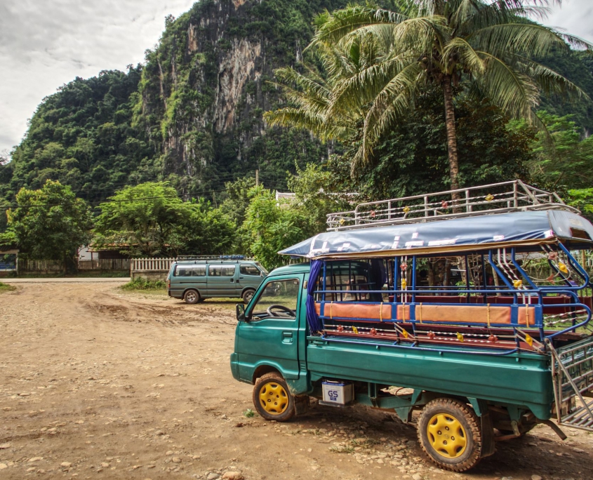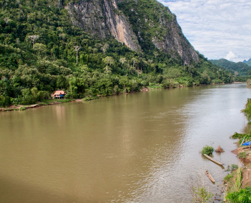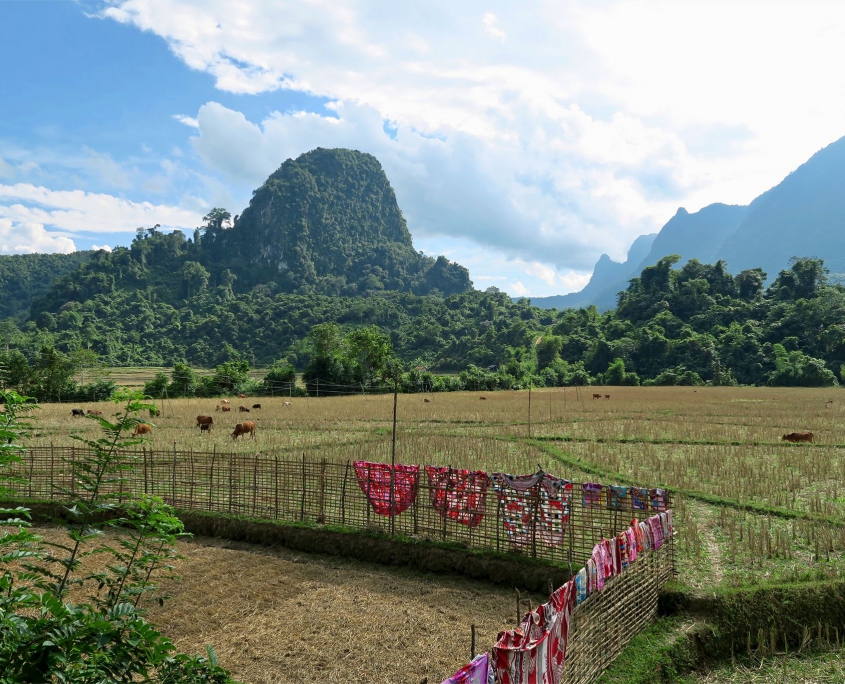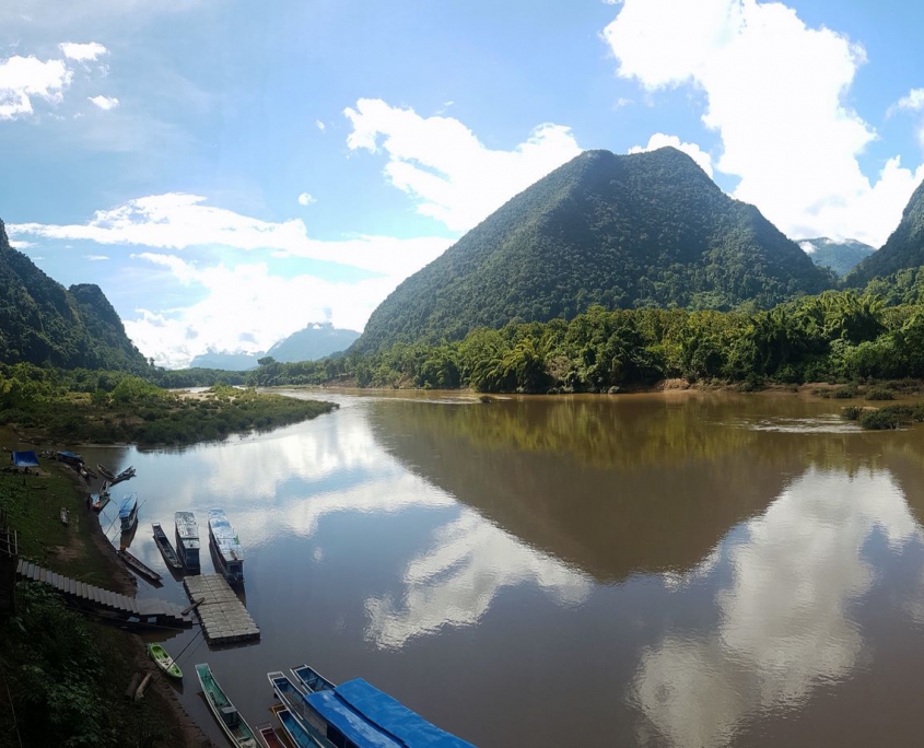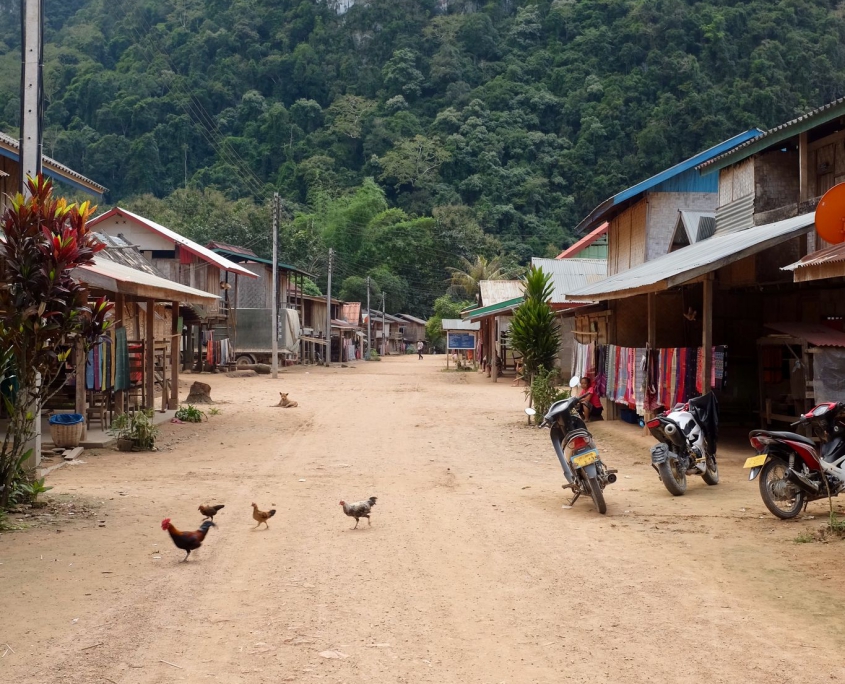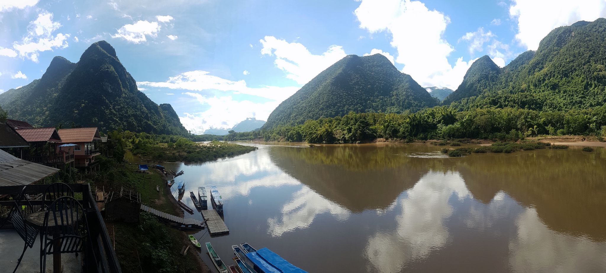 Nong Kiaw ist mit dem Bus in drei Stunden von Luang Prabang aus erreichbar. Es sind drei sehr holprige Stunden und zwischendurch sieht man immer wieder ausgewaschene Stellen. Die Regenzeit ist noch nicht lange vorbei, was wir auch gut am Wetter noch merken. Es ist viel bewölkt und es regnet noch ab und zu.