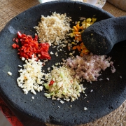 Heute Morgen versuche ich mich im balinesisch kochen – ich habe einen Kochkurs gebucht. Wir werden von den Homestays eingesammelt und auf dem Markt gefahren. Dort erfahren wir viel über die verschiedenen Gemüse und Gewürze und auch über die täglichen Opfergaben. Vor jedem Haus liegt jeweils mindestens eine kleine Opferschale und man muss aufpassen, dass man da nicht drauftritt. Tatsächlich werden täglich pro Haushalt etwa 10-20 solche Opfergaben verbraucht und sind überall zu finden, nicht nur vor der Haustüre.