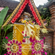 Heute ist in Bali Kuningan Tag, der letzte Tag des Galungan-Fetes. Vor 10 Tagen wurde vor jedem Haus und Geschäft ein Pfosten errichtet (der Penjor), der heute besonders Ausgeschmückt und mit Gaben versehen wurde. Überhaupt wurde alles rausgeputzt, die Autos, die Mopeds und die Statuen vor dem Eingang.